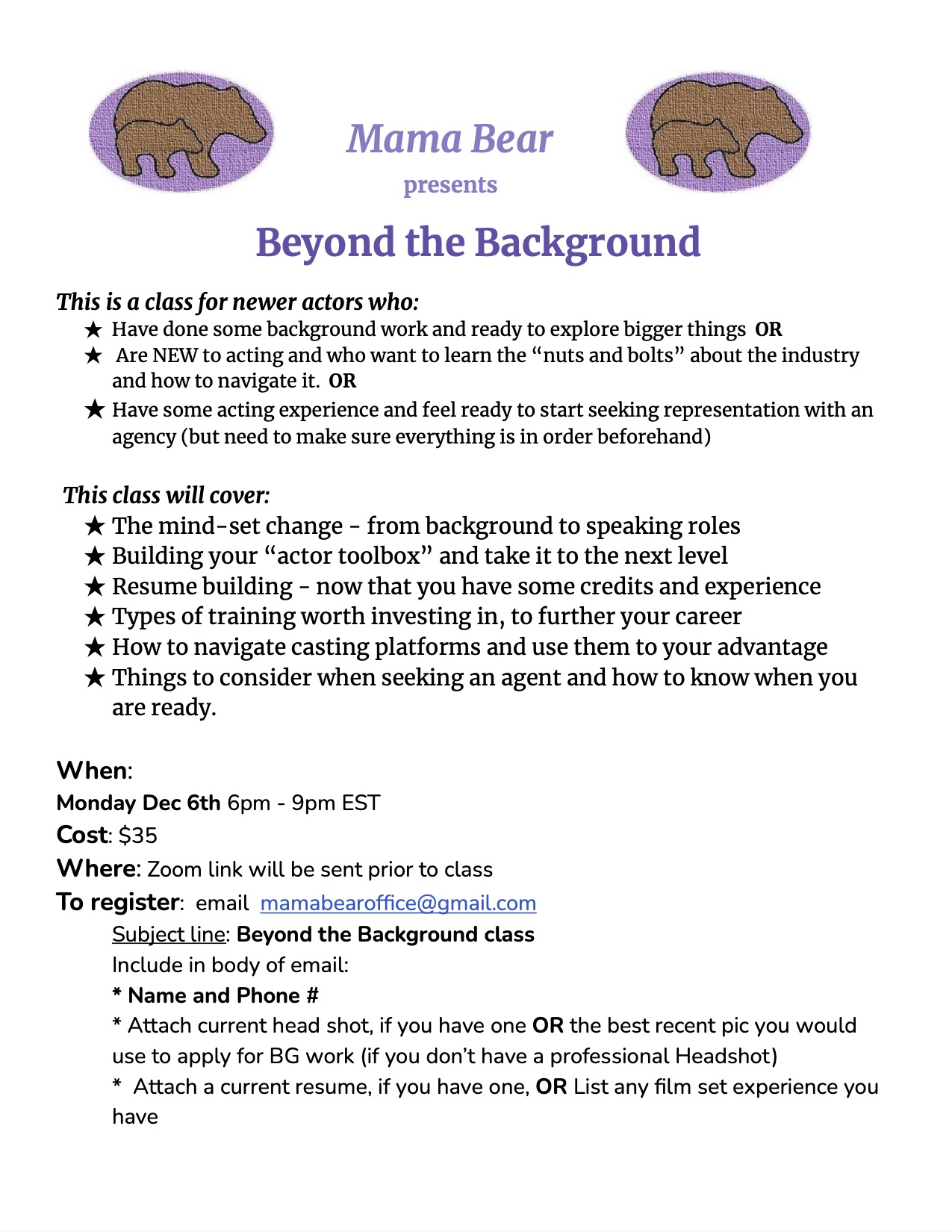 As Mama Bear, I am dedicated to helping productions fill their casting